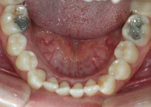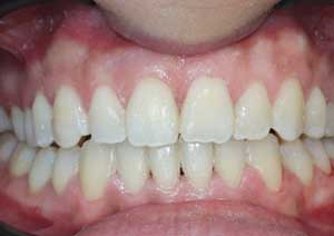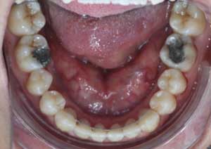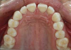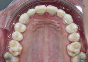 Traitement : Une ingression des molaires maxillaires avec une égression contrôlée du secteur antérieur a été réalisée à l’aide des arcs dits “Rocking Chair”, associés à des élastiques antérieurs portés de canine à canine, à droite et à gauche.